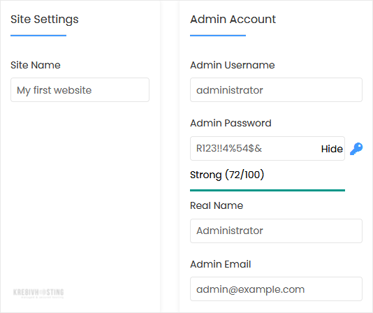 • Admin Username: Your new e107 username (for security reasons, do not use the administrator or the admin username).
